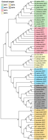 Phylogenetic tree of the SST family members in selected vertebrate species. The tree was constructed using mega 7.0 and the maximum likelihood approach. Bootstrap testing was based on 500 replicates. The SST genes of S. argus are denoted by triangles. Genbank accession numbers of these genes are provided in Table S2.