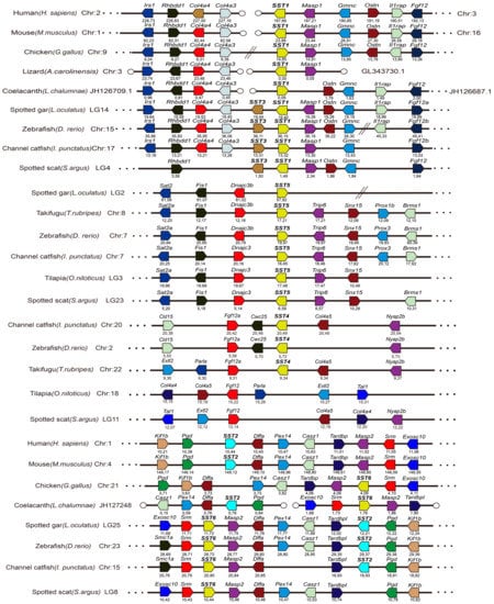 In order to analyze the evolutionary relationships of SST1, SST3, SST5, and SST6 in S. argus with other species, a phylogenetic tree based on the amino acid sequences was constructed (Figure 2). It was observed that the four SST genes from S. argus clustered into four distinct branches, along with orthologous genes of other vertebrate species, although the support for the SST3, SST5, and SST6 branches was low. Additionally, S. argus was most closely related to the scorpion fish. The SSTs exhibited high amino acid identity with other vertebrate species analyzed here. Specifically, SST1, SST3, SST5, and SST6 shared 45.2–93.5%, 47.4–92.1%, 40.2–77.9%, and 52.7–96.1% similarity to other known vertebrate SSTs (Table S2), respectively. The SST1 and SST3 amino acid sequences shared the highest sequence identities with their grouper (E. coioides) orthologs, which were 93.5% and 92.1%, respectively. The SST5 and SST6 shared the highest sequence identities with tilapia (O. niloticus) and grouper (E. coioides), which were 77.9% and 96.1%, respectively. For these four SST genes, syntenic analyses were carried out to lend additional support to the accuracy of the SST phylogenetic analysis. Conserved syntenic regions were identified, and the SST orthologs from S. argus and other species were determined. Taken together, these analyses suggest that the annotations attributed here were, in fact, appropriate (Figure 3).