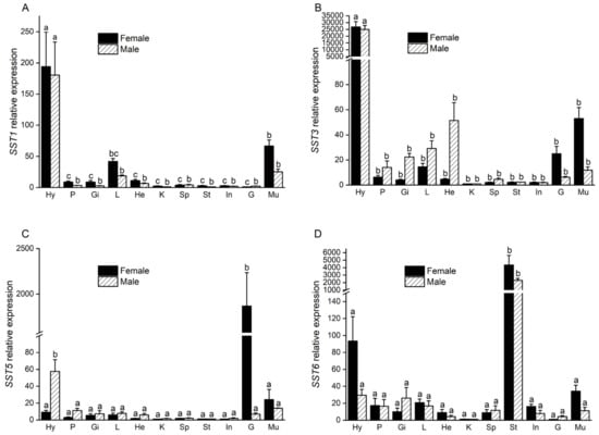 The relative expression levels of female and male S. argus SST1 (A), SST3 (B), SST5 (C), and SST6 (D) in different tissues. The error bars represent the standard error of the means of three independent replicates. Significant differences between male and female fish were compared separately. Different letters above the error bar indicate statistical differences at P < 0.05, as determined by one-way Analysis of Variance (ANOVA) followed by a Duncan’s post hoc test. Hy: Hypothalamus; P: Pituitary; Gi: Gill; L: Liver; He: Heart; K: Kidney; Sp: Spleen; St: Stomach; In: Intestine; G: Gonad; Mu: Muscle.
