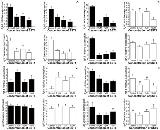 Compared with the control group, SST1 significantly inhibited the expression of Igf-1 and Igf-2 in hepatocytes at different concentrations (control, 0.1, 1, or 10 μM) and incubation times (3 or 6 h) (Figure 5A). Similarly, SST3 inhibited Igf-1 and Igf-2 expression at 3 h. However, after 6 h of treatment, Igf-1 expression was significantly decreased in the 10 μM group only (Figure 5B). At 3 h of treatment, SST5 had no discernable effect on either Igf-1 or Igf-2. However, at 6 h, a significant increase in the expression of Igf-1 was observed (Figure 5C). The expression of Igf-1 and Igf-2 were significantly reduced at 3 h following incubation with SST6. After 6 h, incubation of hepatocytes with 10 μM SST6 resulted in a significant decrease in Igf-1, and a significant increase in Igf-2 expression (Figure 5D).
