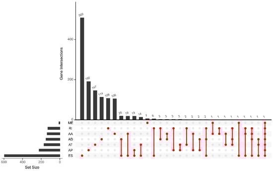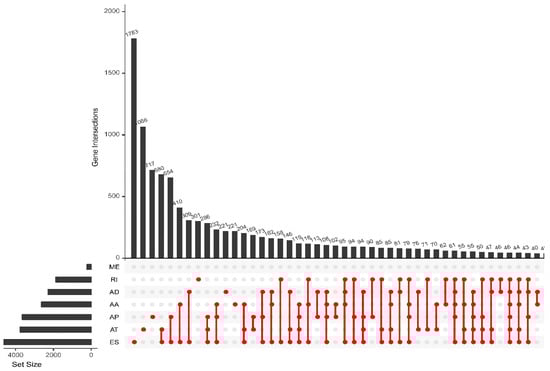 - Conway, J.R.; Lex, A.; Gehlenborg, N. UpSetR: An R package for the visualization of intersecting sets and their properties. Bioinformatics 2017, 33, 2938–2940. [Google Scholar] [CrossRef] [PubMed]