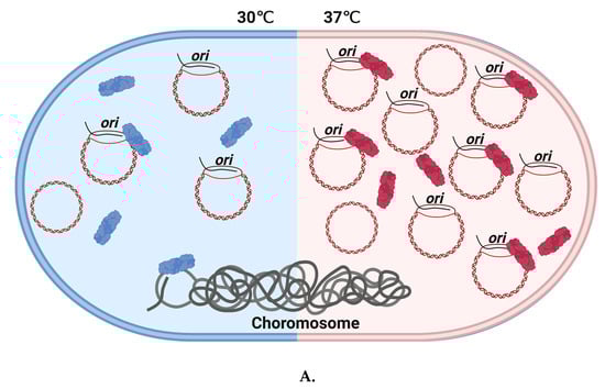 - Radovcic, M.; Culo, A.; Ivancic-Bace, I. Cas3-stimulated runaway replication of modified ColE1 plasmids in Escherichia coli is temperature dependent. FEMS Microbiol. Lett. 2019, 366, fnz106. [Google Scholar] [CrossRef]