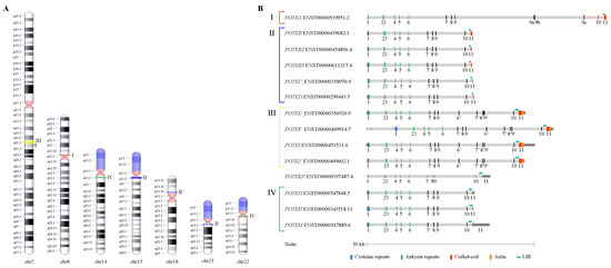 In humans, all POTE genes have 11 exons in common. The overall size of the genes varies from ~32 to ~71 kb, depending mainly on the length of introns 6 and 9. All POTE genes contain a conserved 3′ UTR LINE-1 element, which promotes POTE dispersal in the primate genome [16], while all chromosome 2 POTEs (members of the POTE gene group 3), except for POTEKP, contain a C-terminal in-frame fusion with an actin gene as a result of a retrotransposition event in one of the ancestral POTE paralogs before the divergence of OWMs and apes. This insertion led to the formation of a new chimeric protein that contains both POTE and actin modules in the same protein [15,19,20,22,24]. Some members of the POTE family also include a long inverted repeat (LIR), described both in human and nonhuman primate genomes, which is able to form a large stem-loop and can play a role in expression variation [24]. POTE proteins include an N-terminal cysteine-rich region, five to seven ankyrin repeats made of tandemly repeated modules of ~33 amino acids each, and a C-terminal spectrin-like domain predicted to be mainly α-helical [15,22,23]. These features, together with the evidence of being associated with the plasma membranes, suggest that POTE proteins can be involved in protein-protein and cell membrane interactions [22].
