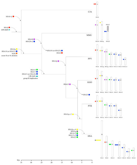 - Johnson, M.E.; Viggiano, L.; Bailey, J.A.; Abdul-Rauf, M.; Goodwin, G.; Rocchi, M.; Eichler, E.E. Positive selection of a gene family during the emergence of humans and African apes. Nature 2001, 413, 514–519. [Google Scholar] [CrossRef]