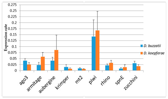 Expression differences between parental species (Figure 1 and Table 3) are statistically significant for all the studied genes except for piwi (p = 0.428). Aub shows the largest ER difference between parental species (2.24-fold difference, ERDbu = 4.12 × 10−2, ERDko = 8.62 × 10−2). However, these differences do not follow a single trend, since some genes are more expressed in D. koepferae (armi, aub, piwi, and snpE) while others are more expressed in D. buzzatii (ago3, krimp, and zuc).