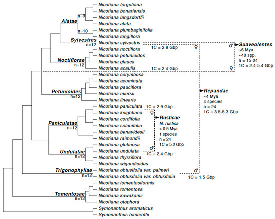 A combination of genomic, cytogenetic and phylogenetic work over the past two decades has established the parentage and age of the allotetraploid species of Nicotiana [14,15,16,17,18]. At the younger end of the spectrum (<0.5 Ma) is the commercial species, N. tabacum L., the common smoking tobacco. The closest extant relatives of the parental lineages for N. tabacum (section Nicotiana) are well-established as being N. tomentosiformis Goodsp. (paternal; T-genome donor) and N. sylvestris Speg. (maternal; S-genome donor) [9,14] (Figure 1). Young polyploids are also found within the sections Rusticae and Polydicliae. Nicotiana rustica is formed from N. undulata Ruiz & Pav. (paternal) and N. paniculata L. (maternal) in <0.5 Ma ([14,19]; Figure 1). Section Repandae formed approximately 4 Ma, between N. obtusifolia M.Martens & Galeotti (paternal) and N. sylvestris (maternal) and consists of four taxa (Figure 1): N. repanda, N. stocktonii Brandegee, N. nesophila I.M.Johnst. and N. nudicaulis S.Watson [11,14,18,19]. Finally, the largest section of polyploid taxa is section Suaveolentes (approximately 50 species), which is also the oldest section of allotetraploids, appearing at approximately 6–7 Ma [18,20]. The parentage of this section is probably more complex and likely involves N. sylvestris (paternal sub-genome donor) and a homoploid hybrid as the maternal subgenome donor (between sections Noctiflorae and Petunioides; Figure 1). The section Suaveolentes also includes the important model N. benthamiana that is used extensively for plant-viral interaction studies. Recent genomic analysis using gene-based phylogenetic trees indicated that approximately 1.4 Gbp of the N. benthamiana genome is attributable to N. noctiflora Hook. as the maternal parent [20] and thus, we consider N. noctiflora as a close relative of the maternal parent for N. benthamiana.