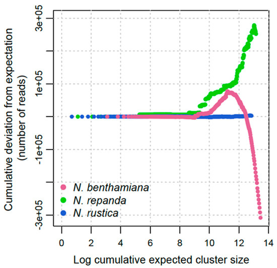 Repeat dynamics for N. rustica (section Rusticae), N. repanda (section Repandae) and N. benthamiana (section Suaveolentes). Curves for each accession represent the absolute cumulative deviation from expectation (sum of parental values). Clusters are ranked from smallest (left) to largest (right), plotted on a natural log scale.