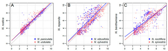In the youngest polyploid, N. rustica, there is a stronger correlation between the parental cluster size and that of the tetraploid (Figure 3A), with a statistically significant difference between the slope of the two parental regression lines (p = 0.0201). For both older tetraploids, N. repanda (p = 0.0002) and N. benthamiana (p = 0.0046) the slopes were found to be significantly different between the maternal and paternal progenitors (Table 1; Table S1), although visually there is a lack of obvious pattern or direction in the regressions (Figure 3B,C). Untransformed plots (Figure S1) and LOESS plots (Figure S2) are additionally shown in Supplementary Materials.
