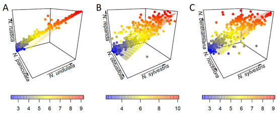 Results of 3D regression analyses. Cluster size is coloured from blue (low) to red (high). (A) N. rustica against N. paniculata (maternal) and N. undulata (paternal). (B) N. repanda against N. obtusifolia (paternal) and N. sylvestris (maternal). (C) N. benthamiana against N. noctiflora (maternal) and N. sylvestris (paternal).