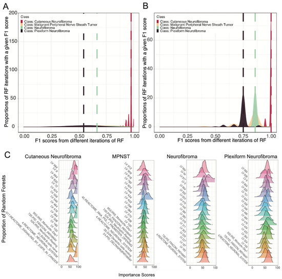 We generated a random forest using NF-specific latent variable scores (Table S1) as described in the Materials and Methods section and depicted in Figure S2. Given the limited number of samples in our dataset, particularly for some tumor types, we anticipated high variability in the performance of our supervised learning model. To obtain a distribution of model performance, we generated 500 training sets (using stratified sampling from the full dataset without replacement), each training their own random forest. We used the distribution of model accuracy measurements and feature importance scores from these forests to estimate overall model performance and feature importance (Figure 2A). We then compared the class-specific accuracy measurements (median accuracy scores: cNF = 0.97, MPNST = 0.67, NF = 0.67, pNF = 0.57) (Figure 2A) to those from forests built with only the top 40 LVs from each class (a total of 98 LVs) from the first forest ensemble. Using the top 40 set of LVs, we were able to improve model performance for each tumor type on an independent test set (median accuracy scores: cNF = 1.00, MPNST = 0.86, NF = 0.86, pNF = 0.75) (Figure 2B). For each tumor type, reducing the feature set to these 98 LVs significantly improved the median accuracy scores for the models (Mood’s median test p-values: cNF < 2.2 × 10−16, MPNST = 3.789 × 10−11, NF = 7.297 × 10−09, pNF < 2.2 × 10−16). This suggested that the 98 selected LVs with high importance scores for each tumor type were sufficient for characterizing the specific tumor types (Figure 2C).