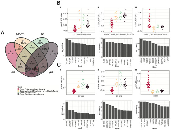 Selected latent variables (LVs) represented gene combinations unique to each tumor type. (A) Venn diagram showing the distribution of the top 40 LVs from each tumor type. (B,C) Total values of the LVs as measured by multiPLIER across samples are represented in the dot-plots, where color of the dots represents the tumor type (“Class” label colors described in the lower left). Loading values for the top 10 genes for each LV are represented in bar-plots below. The higher the loading, the greater impact that the gene expression had on the total multiPLIER value. (B,i–iii) Genes constituting the latent variables associated with known cell signaling pathways. (C,i–iii) Genes constituting the uncharacterized latent variables.