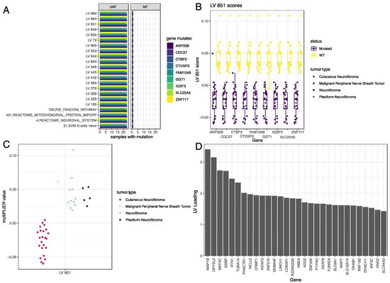 We identified 22 latent variables that were significantly (Benjamini–Hochberg adjusted p < 0.01) associated with single gene variants (Table S3). These latent variables, along with the genes whose variants are associated with altered expression, are depicted in Figure 4A. This approach failed to identify any genes that were mutated across multiple tumor types. In the list of genes in which variants were associated with changes in latent variable expression, we identified nine genes with variants in cNFs and two genes with variants in one neurofibroma sample. An example of how these variants are associated with the expression of a latent variable is depicted in Figure 4B. Mutations in the nine cNF-variant genes are associated with lower expression of LV 851. Because most of these variants occur in cNF samples but not in the other tumor types, it is not surprising that this latent variable is down-regulated across all cNFs (Figure 4C). Figure 4D shows that the MAP1B gene, which has been reported to play a role in glioblastoma [51] but has not been studied in NF1-linked tumors, is a major contributor towards this LV.