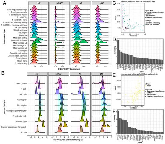 Various immune cell signatures correlated to specific LVs that differentiate tumor types in NF1. (A) CIBERSORT deconvolution of bulk nerve sheath tumor expression data predicted the presence of activated mast cells and M2 macrophages and resting CD4+ memory T cells in all of the tested tumor types. (B) MCP-counter based deconvolution of bulk nerve sheath tumor expression data predicted the presence of cancer-associated fibroblasts across all tumor types, and diversity in T cell population across tumor types. (C) Correlation of CIBERSORT immune score (x-axis) with expression of latent variable 546 highlighted the increased presence of activated mast cells and resting dendritic cells in cNFs (circles). (D) Top 20 gene loadings of LV 546. (E) Correlation of MCP-counter score of Tell infiltration (x-axis) with LV 540. (F) Top 20 gene loadings of LV 540.