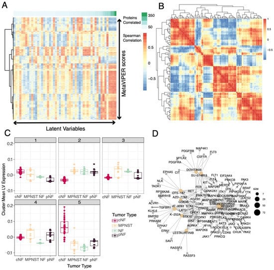 As seen in previous work [43], we observed that multiple latent variables exhibit similar correlation patterns with active proteins (Figure 6A). We clustered the correlation scores to see if we could group the latent variables with similar protein activity predictions (Figure 6B). In clustering the latent variable–protein activity scores, we observed five distinct clusters of latent variables with similar predicted protein activities (Figure 6B). Aggregation of each cluster of latent variables (mean expression within each cluster) demonstrated that these functional clusters were differentially expressed in the different NF1 tumor types (Figure 6C).