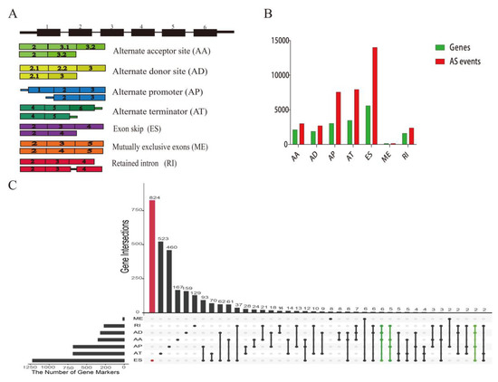 As a result, a total of 37996 AS events in 17,911 genes in UM were detected, which included 5599 ESs in 14,019 genes, 1619 RIs in 2388 genes, 2130 AAs in 3022 genes, 1891 ADs in 2705 genes, 3048 APs in 7565 genes, 3465 ATs in 7938 genes, and 159 MEs in 159 genes (Figure 1B). These results also revealed that one gene may have multiple types of alternative splicing events. Even one gene might undergo up to four types of alternative splicing. Among types of AS events, ES was the most frequent type of the alternative splicing events and the infrequent types were ME events (Figure 1C).