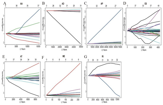 Construction of seven splicing types of prognostic markers based on least absolute shrinkage and selection operator (LASSO) analysis. LASSO coefficient profiles of survival-related alternative splicing (AS) events: (A) AA, alternate acceptors; (B) AD, alternate donors; (C) AP, alternate promoters; (D) ES, exon skip; (E) AT, alternate terminators; (F) ME, mutually exclusive exons; (G) RI, retained introns. The lines stand for each survival-related AS events in seven splicing types respectively and candidate AS events were selected by using 10 fold cross-validation via minimum criteria; X-axis is stand for LASSO coefficient profiles of survival-related alternative splicing (AS) events. Y-axis means tuning parameter (lambda) selection in the Lasso regression.
