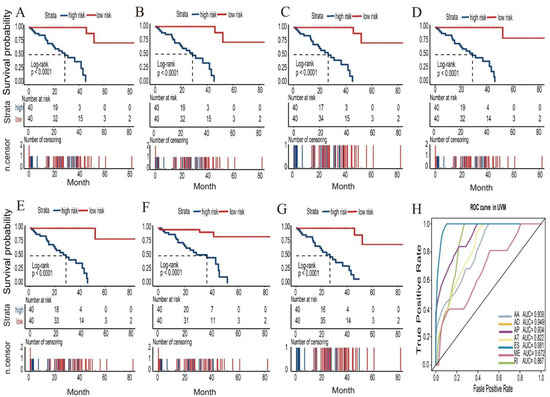 Kaplan–Meier plots and receiver operating characteristic (ROC) curves of predictive factors in UM cohort. (A–G) Kaplan–Meier curves of prognostic models built with alternative splicing (AS) events of alternate acceptor (AA), alternate donor (AD), alternate promoter (AP), alternate terminator (AT), exon skip (ES), retained intron (RI), and mutually exclusive exon (ME) splicing types for patients with UM. Time-dependent numbers at risk are listed at the middle panels and the number of censor patients are listed at the bottom panels. (H) The ROC curves of predictive models for each splicing type in UM.