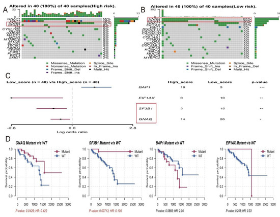 Differential landscape of somatic mutation burden between high and low risk groups. (A) The waterfall plots of the top 20 mutant genes in high risk group. (B) The waterfall plots of top 20 mutant genes in low risk group. (C) Forestplot suggested that three genes GNAQ, SF3B1 and EIF1AX which are highly mutated in low-risk group compared to high-risk group (*** p < 0.001, ** p < 0.01, * p < 0.05). (D) Kaplan–Meier overall survival curves of four different mutated genes. The mutant of GNAQ and SF3B1 have a longer survival time than the wild type. With log-rank P = 0.043 and log-rank P = 0.007 respectively.