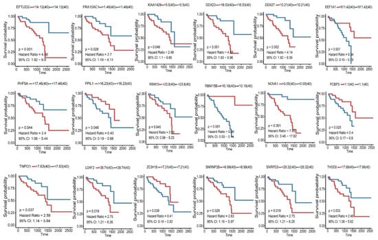 Kaplan-Meier survival analysis for 18 survival-associated splicing factor genes of UM. Their expression levels were classified into two groups by median value. Blue, low-level group; red, high-level group.