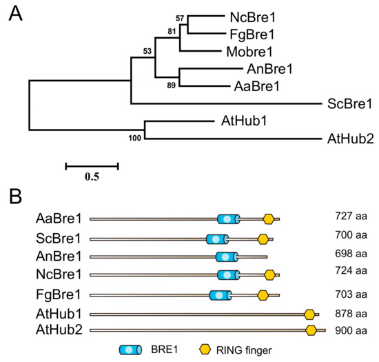Identification of E3 ligase AaBre1 in A. alternata. (A) Phylogenetic analysis of Bre1 homologues in several organisms. The alignment was performed with ClustalW2 and the MEGA program, version 5.1, was used for a phylogenetic analysis using the maximum-likehood tree method. Neurospora crassa (Nc); Aspergillus nidulans (An); Saccharomyces cerevisiae (Sc); Arabidopsis thaliana (At). (B) Domains organization of Bre1 homologues. The domains identified by using Pfam are BRE1 and RING finger.