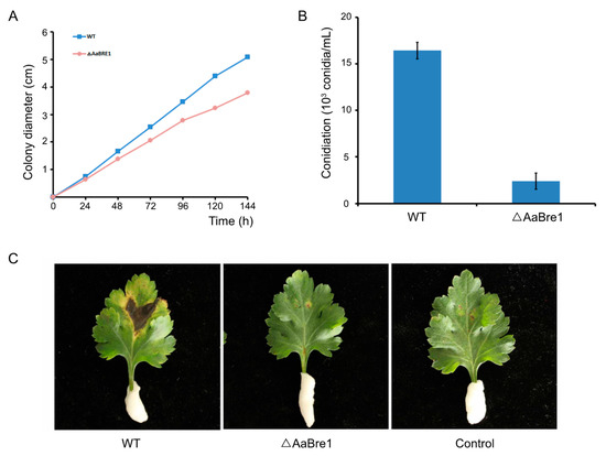 Mycelium growth of ΔAaBre1 was about 30% less than that of WT when the strains were cultured on PDA (Figure 6A). To elucidate the role AaBre1 plays in asexual development, each strain was inoculated on PDA for seven days. After seven days’ growth, fewer conidia were produced by the deletion mutants ΔAaBre1 than by the wild type (WT) (Figure 6B). The results suggest that AaBre1 is essential for normal mycelial growth and conidiation in A. alternata. To analyze the role AaBre1 plays in pathogenicity, infection assays with Chrysanthemum leaves were performed. In the pathogenicity assays, ΔAaBre1 showed reduced virulence, and necrotic lesions were limited to the inoculated position after ΔAaBre1 inoculation. However, severe and expanding necrotic lesions were formed in Chrysanthemum leaves after WT inoculation (Figure 6C). The results above indicate that AaBre1 is necessary for the full virulence of A. alternata.