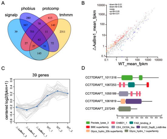 The transcriptomic comparison between the WT and ΔAaBre1 strains showed that 39 of the possible effectors were less strongly transcribed in the mutant ΔAaBre1 (Figure 9B,C). A joint analysis, based on the Pfam database and on the NCBI conserved domain search database, was carried out to assign functional domains to these down-regulated genes. In addition, Glyco_hydro, Pectate_lyase and the chitin-binding domain were identified in five of the predicted products of the 39 DEGs, as shown in Figure 9D. Plant cell wall-degrading enzymes (PCWDEs), containing the Glyco_hydro or Pectate_lyase domain, help most necrotrophs form inconspicuous appressoria and penetrate the plant cuticle [34]. In the study, three differentially expressed candidate PCWDEs (CC77DRAFT_1011316, CC77DRAFT_1061819 and CC77DRAFT_237249) were identified. Effectors which harbor a chitin domain, such as Avr4 [36,37] and Ecp6 [35,38], are known to protect fungal cell walls against hydrolysis by plant chitinases. Among our identified DEGs, two genes (CC77DRAFT_1067253 and CC77DRAFT_1055189) containing the chitin-binding domain are significantly down-regulated, which are also important candidate genes involved in pathogen pathogenesis.