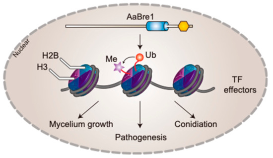 A proposed model of genetic networks regulated by AaBre1-mediated H2B monoubiquitination in A. alternata.