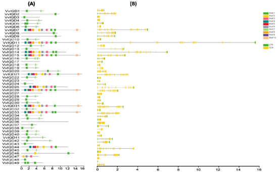 In total 49 putative VvIQD genes were identified from the V. vinifera genome and were denominated as VvIQD1 to VvIQD49 depending on their phylogenetic position relative to their associated orthologous gene pair of Arabidopsis (Table S2). Biochemical analysis demonstrated that the cDNA length ranged from 552 bp (VvIQD48) to 5042 (VvIQD7) with an average cDNA length of 2502.51 bp. Protein length varied from 137 aa (VvIQD48) to 1558 aa (VvIQD21) with an average protein length of 732.76 aa. The theoretical isoelectric point (pI) and molecular weight (MW) ranged from 4.72 (VvIQD3) to 11.02 (VvIQD49) and from 34.31822 kDa (VvIQD24) to 177.18972 kDa (VvIQD31). The prediction of exon numbers varied from 2 (VvIQD3 and VvIQD48) to 39 (VvIQD11, VvIQD21, VvIQD26, and VvIQD31). The sequence features of VvIQDs were analyzed by conserved motifs using the MEME program (Figure 1A). Results revealed 10 conserved motifs (motifs 1–10) with variation in their composition on each IQD gene. Motifs 1 and 7 were the most common among all of the members. We also obtained the LOGOS of 10 conserved motifs for IQD, and their distribution is presented in Figure S1. Gene structure organization analysis was performed based on untranslated regions (UTRs) and coding sequences (CDS) of VvIQD using TBTools. The VvIQD members are highly conserved and exhibited little similarity within subgroups (Figure 1B). Our findings suggest variability between features of the VvIQD gene family.