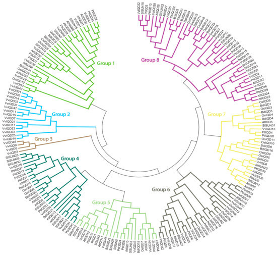A phylogenetic tree was constructed with six species, including Vitis vinfera, A. thaliana, P. patens, O. sativa, B. distachyon, and S. lycopersicum to understand the evolutionary relationship of VvIQD genes (Figure 3). The resulting phylogenetic tree was sub-classified into eight distinct subgroups. Subgroup 2 had the most IQD proteins (15), followed by subgroup 1 (8) and subgroup 8 (6). Subgroups 5 and 6 contained six IQD genes. Subgroups 4 and 7 had the fewest IQD genes each with three and two genes. These results suggest that subgroup2 shows large conservation and might share similar functions to its abundance.