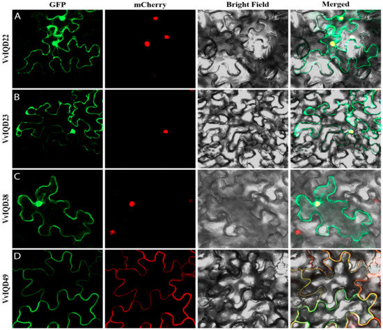 To validate the subcellular localization of certain IQD genes, such as VvIQD22, VvIQD23, VvIQD38, and VvIQD49, they were transiently transformed in N. benthamiana epidermal cells; a construct of 35S-VvIQD:GFP and 35S-GFP as a positive vector was used (Figure 5A–D). The GFP-VvIQD22, GFP-VvIQD23, and GFP-VvIQD38 fusion proteins were in the nucleus, while GFP-VvIQD49 was in the membrane of the N. benthamiana epidermal cells. The GFP proteins with VvIQDs were dispersed throughout the cell.