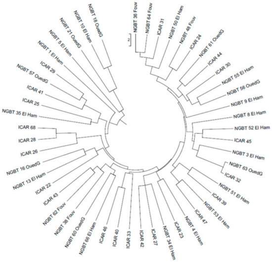 AMOVA indicated that the NGBT and ICAR groups have no statistical difference, at the molecular level (Table 3), as most of the diversity clearly appeared within groups, with only a limited variation occurring among them.