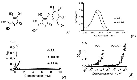 - Murakami, K.; Muto, N.; Fukazawa, K.; Yamamoto, I. Comparison of Ascorbic Acid and Ascorbic Acid 2-O-alpha-glucoside on the cytotoxicity and bioavailability to low density cultures of fibroblasts. Biochem. Pharmacol. 1992, 44, 2191–2197. [Google Scholar] [PubMed]