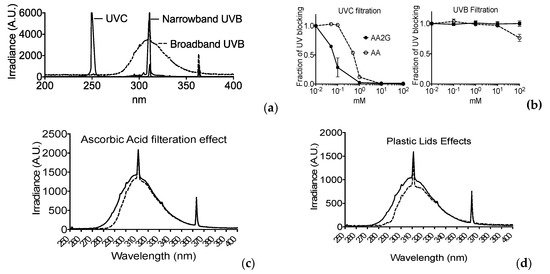 - Suzuki, F.; Han, A.; Lankas, G.R.; Utsumi, H.; Elkind, M.M. Spectral dependencies of killing, mutation, and transformation in mammalian cells and their relevance to hazards caused by solar ultraviolet radiation. Cancer Res. 1981, 41, 4916–4924. [Google Scholar]