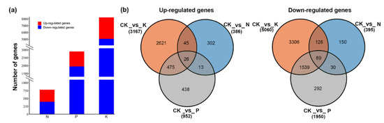 The distribution of differentially expressed genes under nitrogen (N), phosphate (P), and potassium (K) starvation. (a) The number of differentially expressed genes under N, P, and K starvation. (b) The number of up-regulated genes specific to and overlapping in N, P, and K starvation. (c) The number of down-regulated gene specific to and overlapping in N, P, and K starvation.
