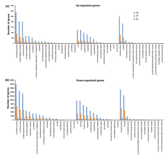 Gene Ontology (GO) annotation of differentially expressed genes under N, P, and K starvation. (a) GO classification of up-regulated genes under N, P, and K starvation. (b) GO classification of down-regulated genes under N, P, and K starvation. The x-axis represents the GO classification and the y-axis represents the number of differentially expressed genes mapped to the GO database.