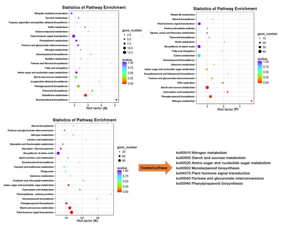 Kyoto Encyclopedia of Genes and Genomes (KEGG) pathway enrichment of differential expressed genes under N, P, and K starvation stress. The top 20 significantly enriched KEGG terms were selected. Each circle represents a KEGG pathway, the x-axis represents the enrichment factor, and the y-axis the name of KEGG pathway. The color of the circle refers to the q-value, and the size of the circle represents the number of genes mapped to the pathway.