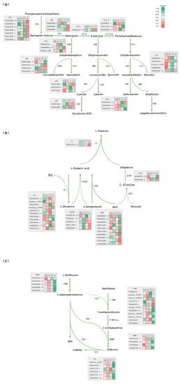 Tea is rich in many secondary metabolites associated with tea quality, such as catechin derivatives (catechins), caffeine, and l-theanine [25,26,27]. Catechins that are known as flavan-3-ols are derived from phenylpropanoid and then flux into the flavonoid pathway via the catalyzation of chalcone synthase (CHS) to chalcone [28,29]. Along with the subsequent branches, ECG, EC, EGC, and EGCG, which are the main flavan-3-ols synthetized from catechin isomers, catechins are produced through a suite of crucial enzymes, including: Chalcone isomerase (CHI), flavanone 3-hydroxylase (F3H), flavonoid 3′-hydroxylase (F3′H), flavonoid 3′, 5′-hydroxylase (F3′5′H), dihydroflavonol 4-reductase (DFR), leucoanthocyanidin reductase (LAR), and anthocyanidin reductase (ANR) (Figure 5a). The expression patterns of these genes related to catechin synthesis exhibited changes that were both specific and common to the N, P, and K deficiency groups. More importantly, most of the genes encoding enzymes in these metabolite biosynthesis under different macronutrient starvation were differentially expressed, which is marked with an asterisk (Figure 5). For example, genes encoding FLS (TEA016601.1, TEA010328.1), F3′H (TEA006847.1), and ANR (TEA026458.1) were up-regulated following N starvation, while DFR (TEA024762.1) was reduced, when compared with the control group. FLS (TEA016601.1, TEA010328.1), F3′H, F3′5′H (TEA026296.1), DFR (TEA024762.1, TEA023829.1), and LAR (TEA021535.1, TEA026458.1) were also down-regulated following P starvation; however upon K starvation, the expression profiles were more complex and the number of responsive genes was highest. More than half of these genes were obviously induced, including CHS (TEA023340.1; TEA023331.1), F3H (TEA023790.1), FLS (TEA010328.1), DFR (TEA032730.1), and LAR (TEA021535.1); however, F3′5′H (TEA013315.1), DFR (TEA024762.1; TEA023829.1), and LAR (TEA026458.1; TEA027582.1) expression was reduced.