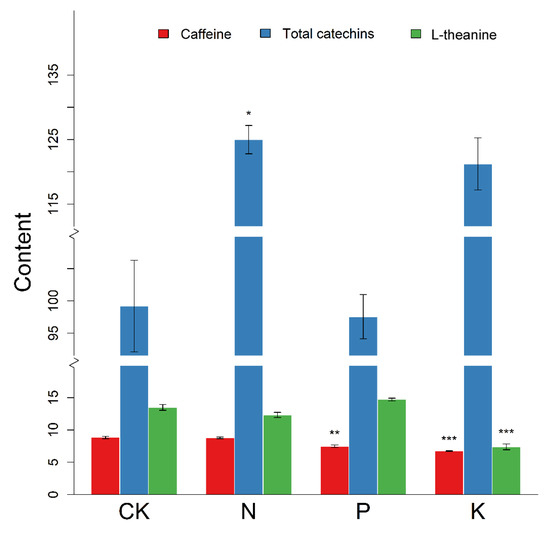 The content (mg/g) of total catechins, l-theanine, and caffeine under N, P, and K starvation. Total catechins is the sum of all individual catechin isomers, that is: Catechin(C), catechin gallate (CG), epicatechin (EC), epicatechin gallate (ECG), epigallocatechin (EGC), epigallocatechin gallate (EGCG), gallocatechin gallate (GCG), and gallocatechin (GC). Asterisks indicate the level of significance compared with the control group (CK) treated with the full nutrient solution. The error bars show the SE. Significance level is represented as stars: *, **, *** refer to p-values: 0.05, 0.01, and 0.001, respectively.