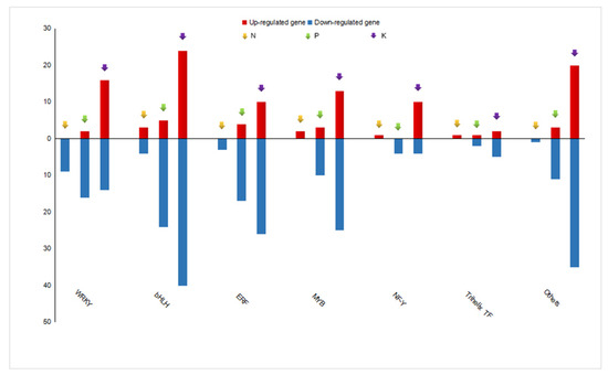Distribution of up-regulated and down-regulated genes encoding transcription factor families in response to N, P, and K starvation. Each bar shows the number of members of the transcription factor family, with up-regulation in red and down-regulation in blue under N, P, and K starvation.