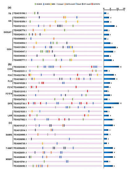 The cis-element of gene promoters in the catechin, l-theanine, and caffeine biosynthesis pathways. (a) The cis-element of promoters of differentially expressed genes in the catechin biosynthetic pathway. (b) The cis-element of promoters of differentially expressed genes in the l-theanine biosynthetic pathway. (c) The cis-element of promoters of differentially expressed genes in the caffeine biosynthetic pathway. The color of bar on the left represents different cis-elements bound by special transcription factor families, and the horizontal column on the right represents the total number of cis-elements of each gene.