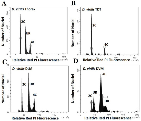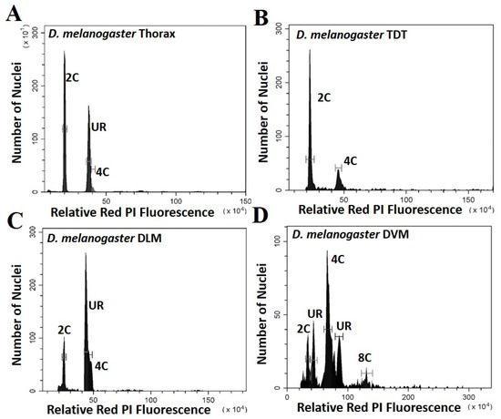 - Johnston, J.S.; Schoener, M.; McMahon, D.P. DNA underreplication in the majority of nuclei in the Drosophila melanogaster thorax: evidence from Suur and flow cytometry. J. Mol. Biol. Res. 2013, 3, 47. [Google Scholar] [CrossRef]