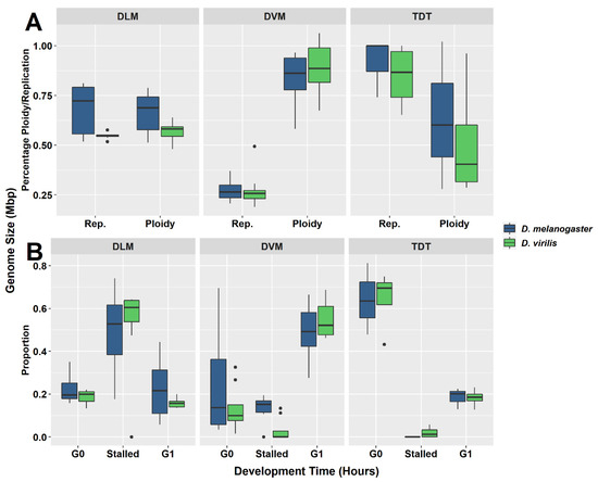 Box-and-whisker plots for each muscle type investigated in D. melanogaster and D. virilis. (A) Distribution of ploidy percentage and replication percentage across tissues. (B) Distribution of proportion of nuclei at G0, G1, or stalled in replication in each muscle type. Each muscle type presents a unique pattern. The intermediate levels of ploidy and replication in dorsal longitudinal muscle (DLM) tissues (A) represent the largest proportion of nuclei stalled during replication (B). The high ploidy percentage ploidy in the dorsal ventral muscle (DVM) (A) is due to the high proportion of nuclei found at the G1 phase (B). Almost no nuclei are found to be stalled during replication in the tergal depressor of the trochanter (TDT) muscle and are predominately in the G0 phase (B).