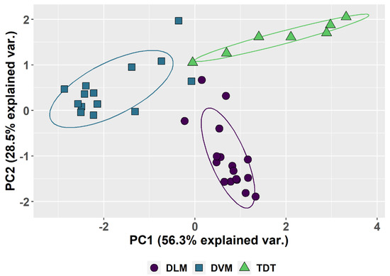Although there is considerable individual variation in the parameters (Table 1, Figure 3), a common pattern is observed for each tissue type (Figure 3A,B). The patterns and the variation among individuals are plotted in box-and-whisker format (Figure 3) as well as in the PCA (Figure 4). The first two principal components account for 85% of the total variation. Component 1 accounts for 56% of the variation and reflects a pattern that consists of 0.51 of replication stall point, 0.417 of the proportion of G0, −0.500 ploidy and −0.526 of the proportion in G1 with little input (0.191) from the proportion replicated (UR). Component 2 accounts for an additional 29% of the variation and reflects a second pattern consisting of −0.775 of the proportion replication and 0.6 of the proportion in G0, with minimal input from the other parameters. Circles drawn about the different tissue types show the common patterns shared by DVM, DLM and TDT.