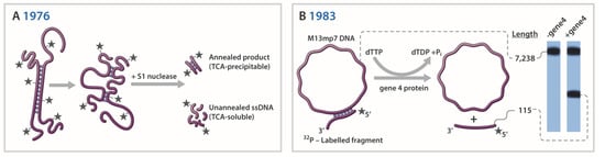 Although assays which relied on nuclease sensitivity or isolation of products by sucrose gradient or bound to nitrocellulose were useful tests for helicase-catalyzed DNA unwinding [1], the choice of DNA substrates was narrow and experimental techniques were tedious and relied on indirect measurements. For improved quantitation and direct visualization of helicase reaction products, a more straightforward assay was in demand. The first direct demonstration that a DNA helicase employs its unidirectional translocation on ssDNA to unwind duplex DNA in a directionally specific manner was provided by Nancy Nossal’s laboratory at the NIH in 1982 [20]. A radiolabeled partial duplex DNA substrate characterized by two different length duplex DNA fragments separated by an intervening long ssDNA tract was incubated with the T4 gene 41 protein in the presence of ATP and the reaction products were resolved on a non-denaturing polyacrylamide gel. Using this technique, it was demonstrated that T4 gene 41 moves in a 5’ to 3’ direction with respect to the strand on which it is bound. In 1983 Matson et al. described a similar DNA substrate in which a complementary strand of a radioactively labeled denatured DNA fragment of defined size was annealed to circular single-stranded M13 viral DNA (Figure 2B). Here the substrate had an additional feature in that it possessed a noncomplementary 3’-tail, thereby resembling a forked duplex [42]. This DNA substrate, and its derivatives in which the length of the noncomplementary single-stranded tail was varied, enabled the authors to determine the minimal DNA substrate requirements of T7 gene 4 protein to unwind the DNA duplex adjacent to the junction. The advantage of a direct helicase assay to measure DNA unwinding was convincingly evidenced by the demonstration that the bacterial UvrD helicase, an enzyme with a vital role in both NER and mismatch repair (MMR), translocates 3’ to 5’ in its unwinding mechanism [49], opposite to the directionality of T4 gene 41 or T7 gene 4 helicase proteins. As discussed by Matson in that paper, the 3’ to 5’ directionality of UvrD helicase has implications for the mechanisms of both the MMR and NER pathways.