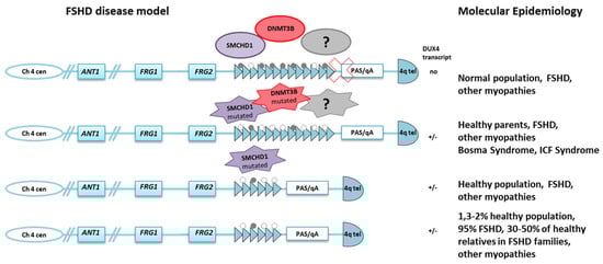 All these observations indicate that accurate diagnosis should not completely rely on molecular findings. Large studies based on clinical evaluation demonstrate that (1) 2% of healthy individuals from the general population bear one FSHD1-sized D4Z4 allele with the possibility of expressing the DUX4 transcript []; (2) the clinical severity of FSHD does not clearly associate with the size of the deletion of the D4Z4 allele [,,]; (3) the penetrance of FSHD is not complete, with 20–50% of relatives carrying FSHD1-sized D4Z4 alleles being healthy [,,,,,]; (4) the disease penetrance decreases among second-fifth degree relatives in FSHD families []; (5) there are families showing affected subjects in one generation, families with a single affected subject, and also subjects with atypical phenotypes in which additional mutations in genes causing other neuromuscular diseases have been found [,,]; in addition, independent studies showed that (6) SMCHD1 mutations cause the Bosma developmental syndrome (OMIM #603457) and D4Z4 hypomethylation has been found in these patients with no documented signs of FSHD [,]; (7) SMCHD1 mutations have been found in subjects with Limb Girdle Muscular Dystrophies (LGMDs) (Tupler, unpublished NGS data); (8) homozygous or compound heterozygous mutations in DNMT3B cause immunodeficiency-centromeric instability-facial anomalies syndrome-1 (ICF1) (OMIM #242860), a syndrome characterized by hypo- or agammaglobulinemia and frequent infections that determine poor life expectancy; and (9) some ICF1 cases showed D4Z4 hypomethylation with no signs of FSHD [] (Figure 3).