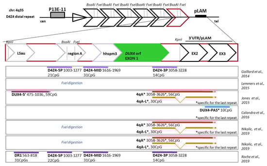 Overview of the D4Z4 repeats and of the region selected in methylation analyses. The D4Z4 array at 4q35 with an enlarged schematic representation of the D4Z4 distal most repeat (from position 1 to 3303 given relative to the two flanking KpnI sites). The different regions within D4Z4 are indicated: LSau repeat (position 1–340), Region A (position 869–1071), hhspm3 (position 1313–1780), DUX4 ORF (position 1792–3063), plus the 3′ pLAM region. The figure highlights the proximal BsaAI and FseI methylation-sensitive restriction sites analyzed by Southern blotting, and the location of bisulfite (BS) PCR products used in the selected literature reports, each represented with a differently colored line. The position of each region within the array, starting form the first KpnI site, is indicated together with the assayed number of CpGs. The white lines within these regions indicate the presence of CpGs in PCR primers.