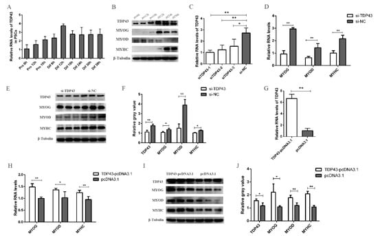 TDP43 promotes the porcine satellite cells (PSCs) differentiation. (A) Real-time PCR analysis of TDP43 expression in PSCs during the period of proliferation and differentiation. There was a 6h interval between each period. (B) Western blot analysis of TDP43, myogenin (MYOG), myogenic differentiation (MYOD), and myosin heavy chain (MYHC) protein expression levels in PSC in different periods. (C) The knockdown efficiency of TDP43 siRNA. (D) qPCR results showed that the mRNA expression of MYOG, MYOD, and MYHC were significantly decreased by TDP43 knockdown. (E) Western blot results showed that the protein expression of MYOG, MYOD, and MYHC were significantly decreased by TDP43 knockdown. (F) Quantitative analysis of Western blot results. (G) The overexpression efficiency of TDP43-pcDNA3.1. (H) qPCR results showed that TDP43-pcDNA3.1 significantly increased the mRNA expression of MYOG, MYOD, and MYHC. (I) Western blot results showed that TDP43-pcDNA3.1 significantly increased the protein expression of MYOG, MYOD, and MYHC. (J) Quantitative analysis of Western blot results. Mean values ± SD, n = 3. * means p < 0.05, ** means p < 0.01.