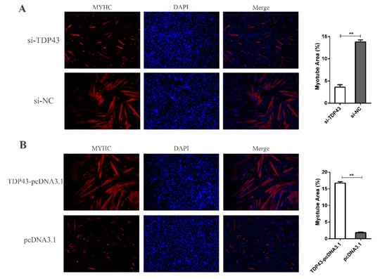 (A) Representative photographs of MYHC immunofluorescence staining in PSCs differentiated for 24 h showing that knockdown of TDP43 significantly decreased the MYHC expression level. (B) Representative photographs of MYHC immunofluorescence staining in PSCs differentiated for 24 h showing that TDP43-pcDNA3.1 significantly increased the MYHC expression level. Mean values ± SD, n = 3. * means p < 0.05, ** means p < 0.01.