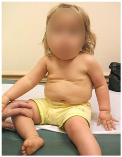 18-month-old female with Prader–Willi syndrome (PWS) maternal disomy of chromosome 15 (UPD) type, displaying the typical hypotonic sitting position.
