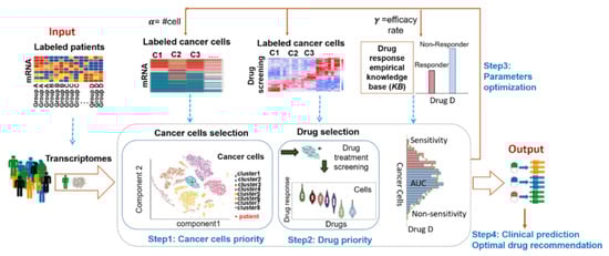In vitro human cell line models have been widely used for cancer pharmacogenomic studies to predict clinical patient response and to help identify either within or between cancer lineages []. Many calculation models for drug sensitivity prediction are set up by connecting these mRNA profiles with drug screening [,,,], including a community effort to assess and improve drug sensitivity prediction algorithms in breast cancer cell lines []. Heiser et al. [] identifies novel molecular portraits associated to compounds’ responses by using a much smaller panel of 49 breast cancer cell lines with sensitivity to a panel of 77 compounds. However, these models are limited to predicting drug responses in cancer cells only, not for a specific patient’s treatment. A central challenge in drug sensitivity research is to create models that bridge the gap between cancer cells and tissues in which the drug responses are manifested for the single patient. The issue of how to utilize these genome mRNA data with drug responses from cancer cells to guide the optimum drugs’ recommendation at the level of single patient has not been addressed.